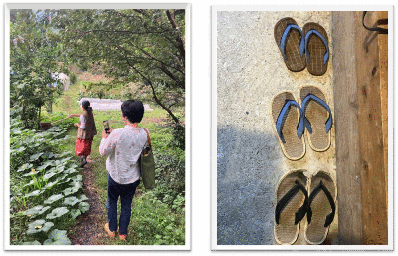 (広い敷地内の畑へ散策するママと井上コーディネーター) (土間の玄関に並んだお子さんたちの草履)