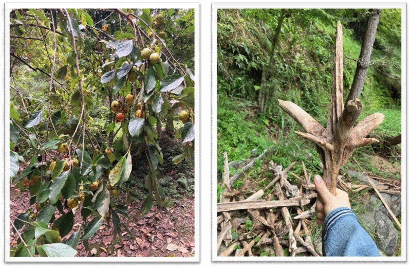 (園内の木々には秋の恵み。) (子どもたちが集めた様々な枝。これは剣のよう!)