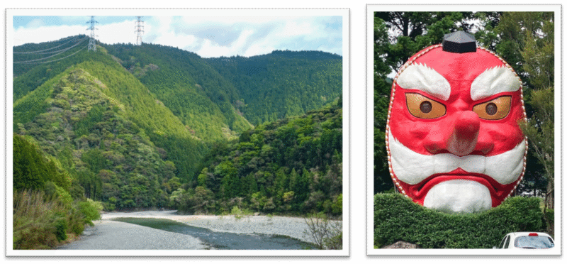 (清流と名高い気田川が流れている) (春野のシンボル的な日本一の天狗面)